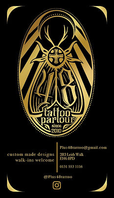 A logo and business card design commissioned by Plus 48 Tattoo Parlour in Edinburgh.